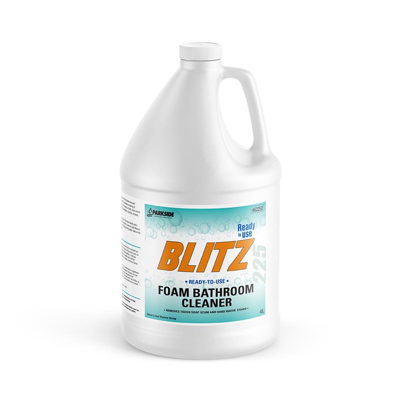 BLITZ is a mildly acidic, high foaming bathroom cleaner that penetrates and dissolves tough soap scum and hard water stains with minimal scrubbing. It contains no bleach or phosphates, is non abrasive, and leaves a fresh, clean scent.