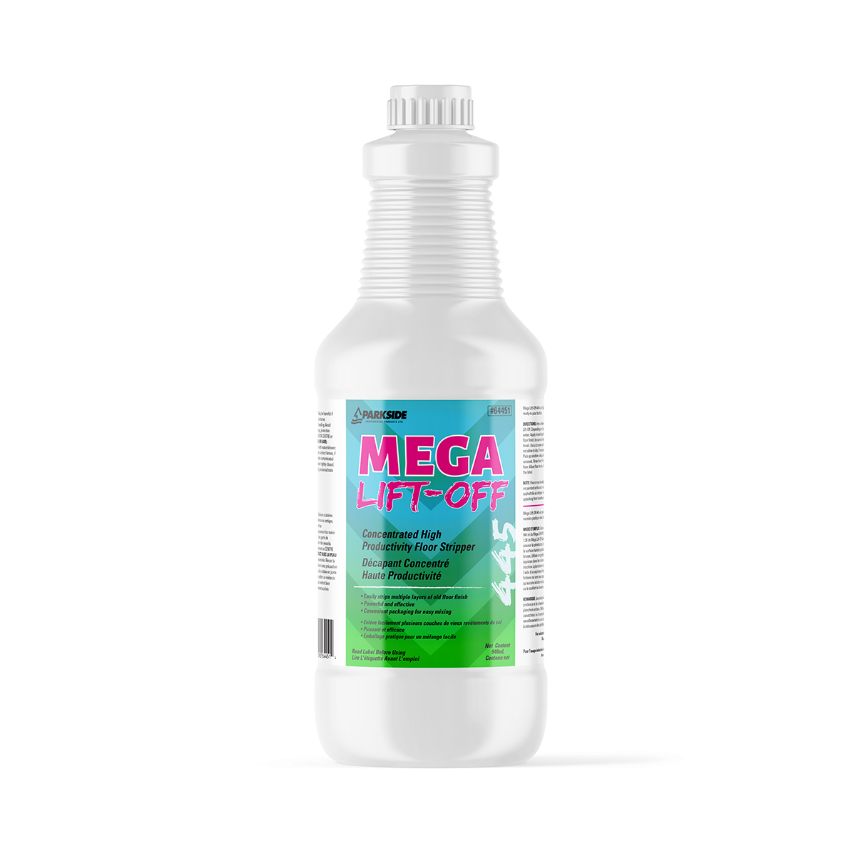 Into a clean mop bucket filled with water, pour one 946ml bottle of Mega Lift-Off. Depending on bucket Size, this will yield a 1:20 to 1:30 dilution of Mega Lift-Off to water. Apply mixed liquid liberally to floor. To insure penetration through multiple layers of floor finish, be sure to leave surface wet for at least 10-20 minutes. Agitate with a mop or brush. Use a scraper or hand pad to remove heavy finish build-up in corners and edges.